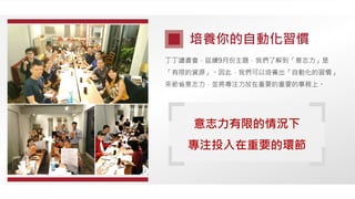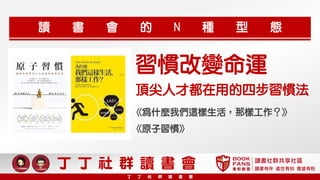 丁丁讀書會專注於培養自動化習慣,減少對意志力的依賴,並通過社群分享和實踐來強化學習。文檔中介紹了關於習慣形成的過程和方法,包括戒除壞習慣與養成好習慣的策略。讀書會旨在提升參與者的知識與應用能力,實現更豐富的人生旅程。
