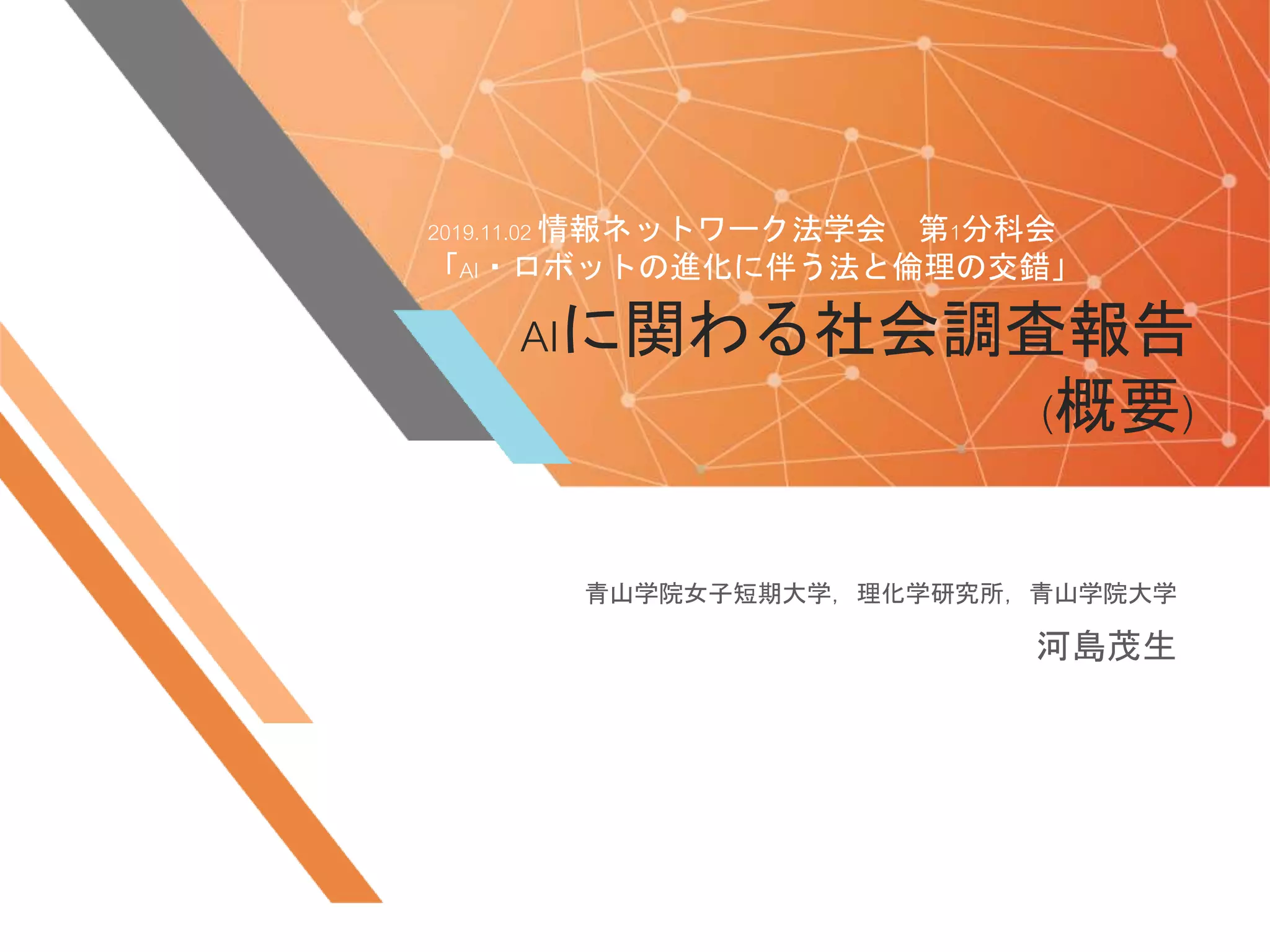 2019.11.02 情報ネットワーク法学会 第1分科会 「AI・ロボットの進化に伴う法と倫理の交錯」のスライド資料