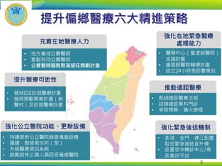 本報告概述了提升偏鄉醫療的六大策略,包括充實在地醫療人力、強化醫院功能及推動遠距醫療等。主要措施包括提供公費醫師補助、更新公立醫療設備,以及加強急救和遠距醫療服務。報告還提到針對偏遠地區的醫療服務計畫及支持措施,以改善醫療可及性和效能。