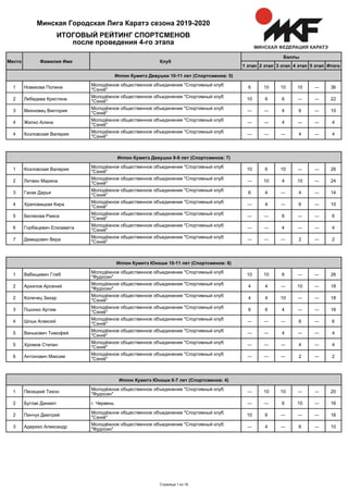 Документ содержит результаты четвертого этапа Минской городской лиги каратэ сезона 2019-2020, в котором участвуют спортсмены различных возрастных групп в дисциплине иппон и ката. Указаны имена спортсменов, их клубы, набранные баллы и итоговые рейтинги. Лидерство в разных категориях занимает Полина Новикова из спортивного клуба 'сэнкё', а также другие спортсмены из нескольких клубов.