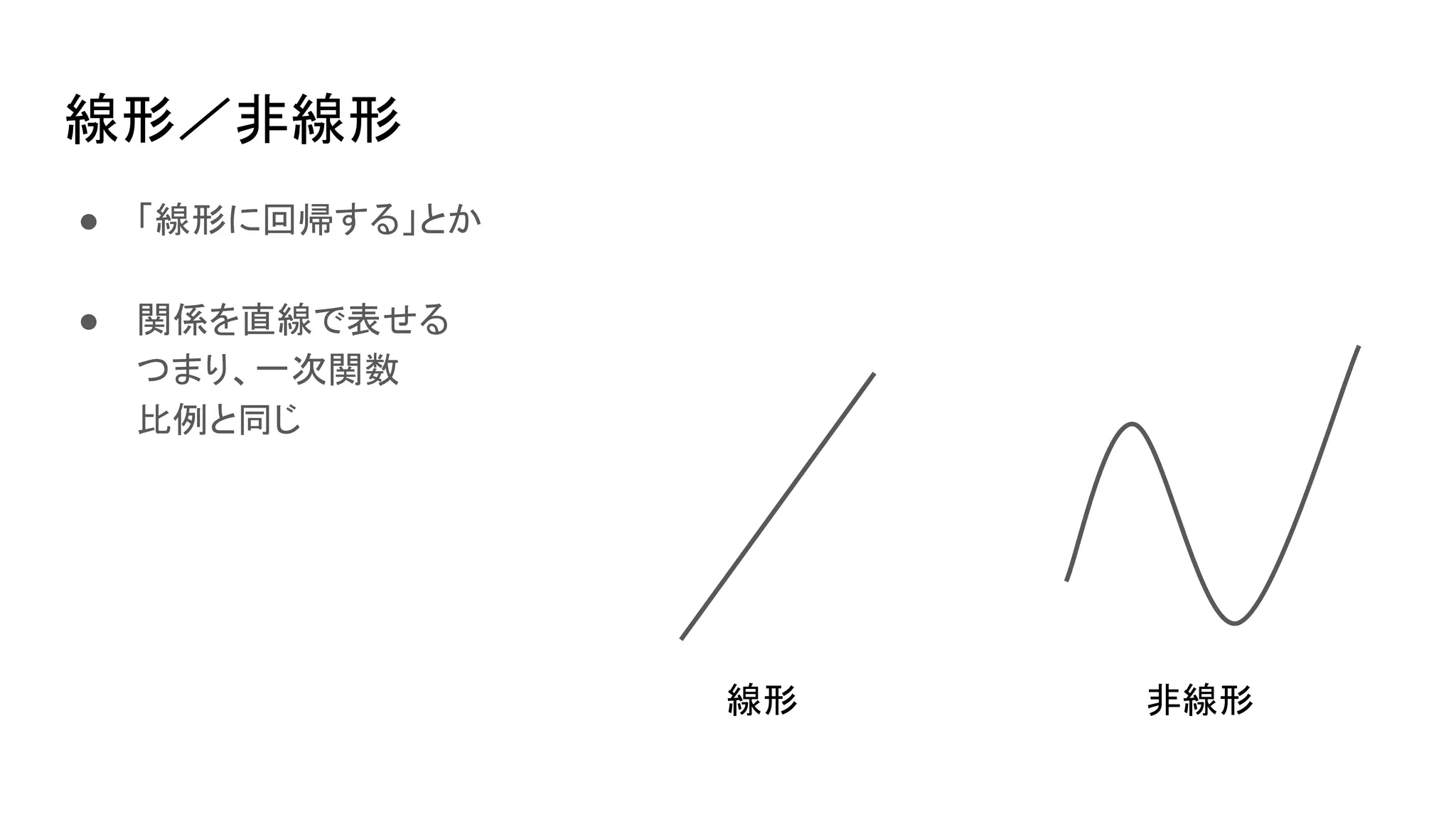 線形/非線形 ● 「線形に回帰する」とか ● 関係を直線で表せる つまり、一次関数 比例と同じ 線形