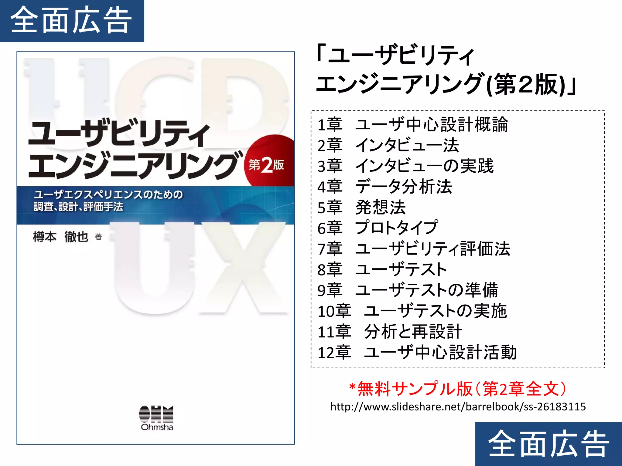 インタビューの実践 4章 データ分析法 5章 発想法 6章 プロトタイプ 7章 ユーザビリティ評価法 8章 ユーザテスト 9章 ユーザテストの準備 10章 ユーザテストの実施 11章 分析と再設計 12章 ユーザ中心設計活動 *無料サンプル版(第2章全文) http://www.slideshare.net/barrelbook/ss‐26183115 全面広告