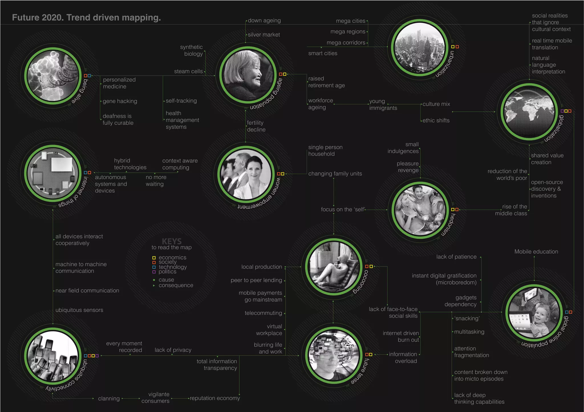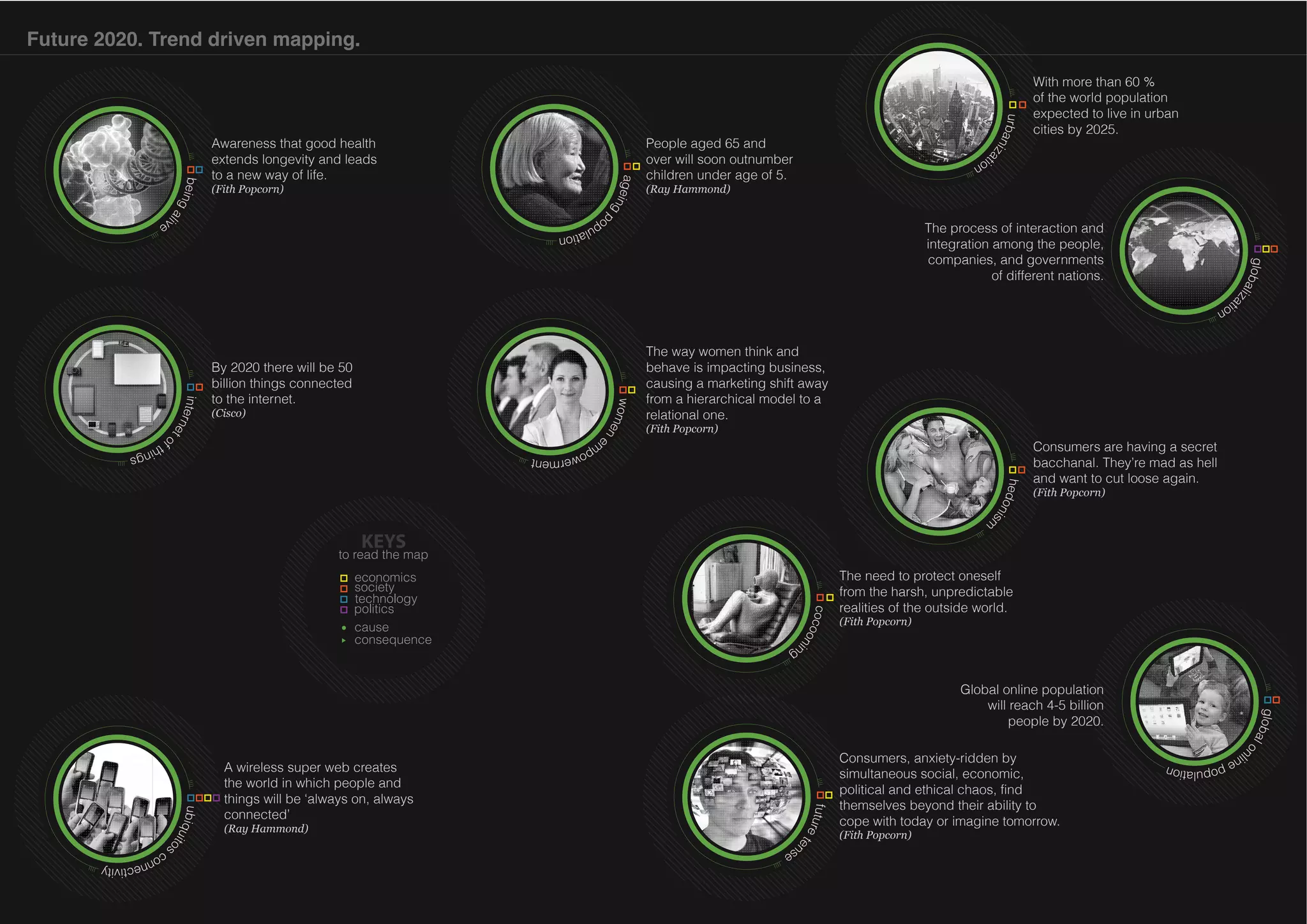The document discusses several trends that will shape the future in 2020, including that people over 65 will outnumber those under 5, over 60% of the world's population will live in urban cities, and there will be 50 billion things connected to the internet. It maps out how technologies like gene editing, autonomous systems, and ubiquitous sensors will impact areas like health, education, work, and more. The trends highlighted point to a future in 2020 and beyond where devices are "always on, always connected" and interact cooperatively to optimize experiences for users.