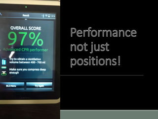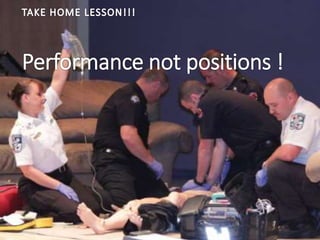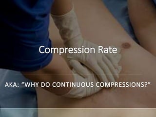 This document discusses high performance CPR techniques to improve outcomes for cardiac arrest patients. It provides 7 mantras of quality resuscitation and discusses key aspects of effective CPR including maintaining a rate of 100-120 compressions per minute, compressing at least 2 inches deep, fully releasing pressure between compressions, minimizing interruptions, and limiting ventilations to 6-10 per minute. The document outlines Ada County's model for high performance CPR using defined roles and positions to focus on continuous, high-quality chest compressions. It also reviews the science demonstrating improved perfusion and survival rates associated with minimizing interruptions and maintaining coronary and cerebral perfusion pressures.
