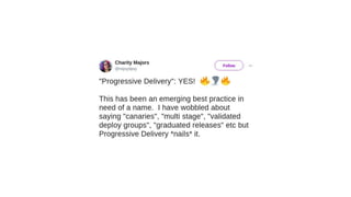 The document discusses progressive delivery as a modern software development and DevOps practice for gradually rolling out features to minimize risks and enhance user engagement. It highlights the importance of collaboration between engineering, product management, and design, as well as the role of observability and experimentation in driving digital transformation and growth hacking in software delivery. Key concepts include feature management and the use of GitOps to improve feedback and collaboration.