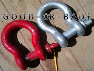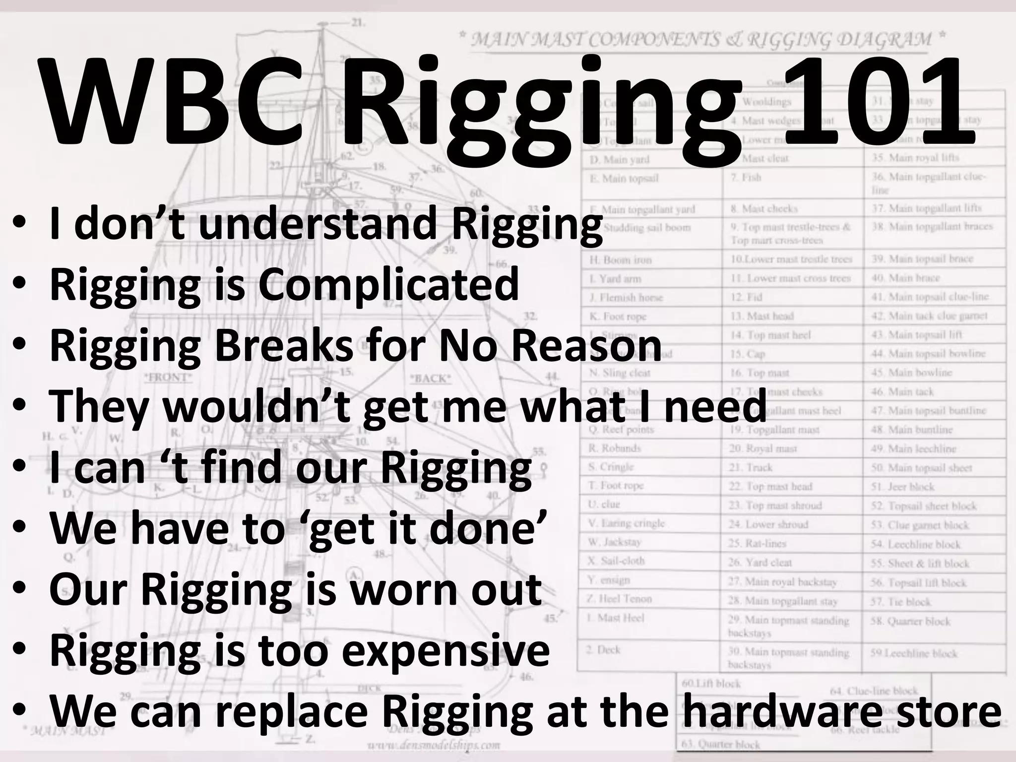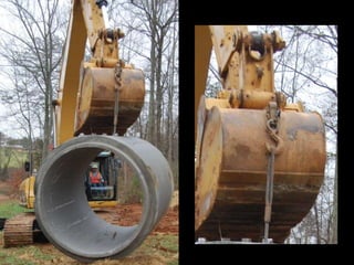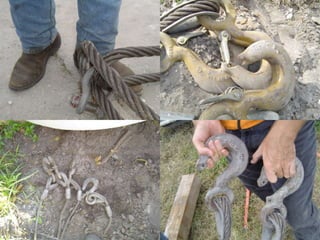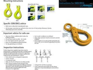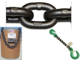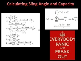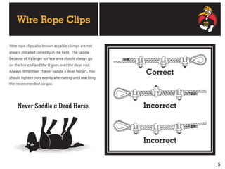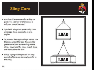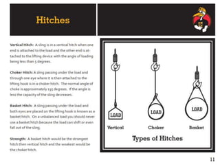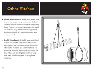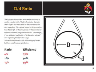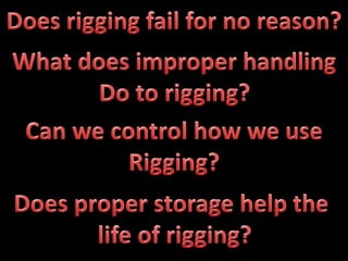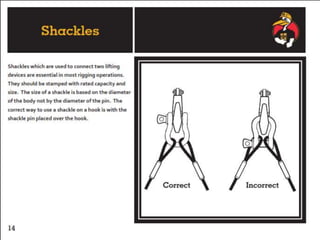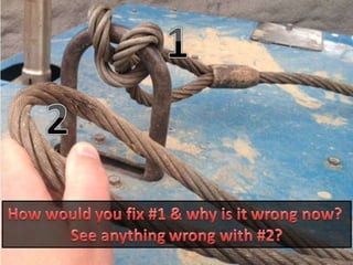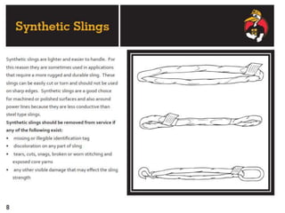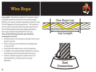 The document discusses various issues with rigging, including that rigging is complicated and breaks for no reason. It also mentions that rigging is worn out and too expensive to replace with hardware store items. The document then provides information on proper rigging use and inspection, including graduation rules for different types of rigging use, manufacturer and wear identification, and inspection criteria. It also covers wire rope construction, types of synthetic round slings, and various rigging configurations and their capacities.
