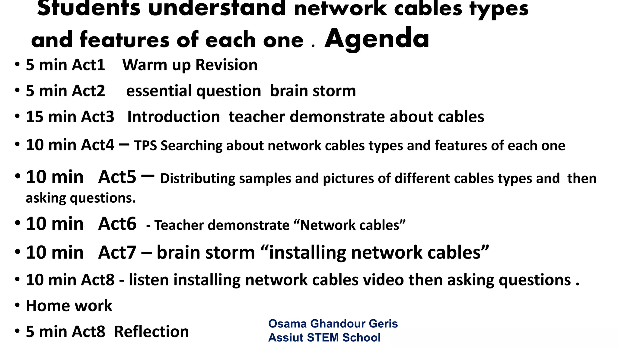 This document outlines a lesson plan focused on understanding network cable types, including coaxial, twisted pair, and fiber optic cables. It details activities that include demonstrations, video reviews, and discussions to enhance students' knowledge about the characteristics and applications of different cables. Additional information covers cable specifications, comparison with other networks, and homework assignments related to the topic.
