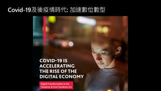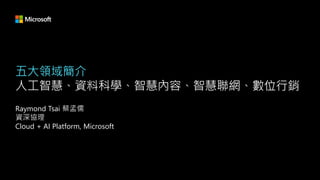 This document introduces five key areas of digital economy: artificial intelligence, data science, smart content, smart networking, and digital marketing. It then discusses industry case studies and the capabilities needed in these fields, as well as opportunities and challenges. Raymond Tsai from Microsoft gives an overview of how COVID-19 has accelerated digital transformation, emphasizing how technologies in these five areas can empower employees, engage customers, transform products, and optimize operations.