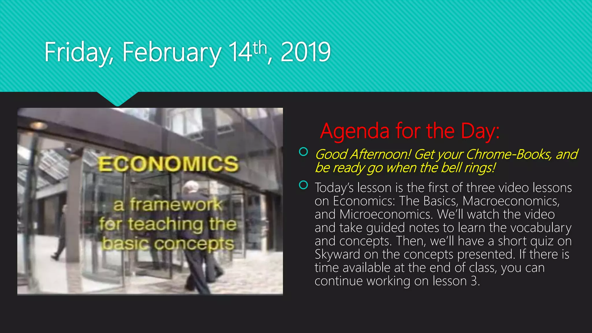 Today's agenda includes watching the first of three video lessons on economics, taking guided notes on the concepts of macroeconomics and microeconomics, and a short quiz on the material. If time permits after the video and quiz, students can begin working on the third lesson.