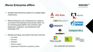 Waves Enterprise offers a hybrid blockchain platform aimed at scalable digital infrastructure, combining rapid deployment and a full suite of services including consulting and support. The document highlights the importance of application security assessments in detecting vulnerabilities early in the development process to avoid significant costs and disruptions. It also discusses various blockchain security requirements and threats, including human factors and software vulnerabilities.
