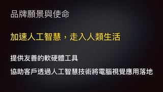 文档描述了一家名为nilvana taka的公司,旨在通过人工智能技术和友好的软硬件工具帮助客户实施计算机视觉应用。该公司采用订阅和硬件捆绑的商业模式,专注于为中小型客户提供AI工作站和边缘设备,并计划在台湾和东南亚市场扩展销售。产品组合包括视觉入口套件、特定领域模型及相关的边缘设备,预计在2021年逐步推出。