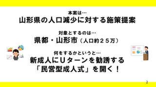 2 本案は… 山形県の人口減少に対する施策提案 対象とするのは… 県都・山形市(人口約25万) 何をするかというと… 新成人にUターンを勧誘する 「民営型成人式」を開く!