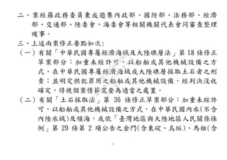 行政院第3724次会议提出修正草案,旨在加重对非法抽砂和土石采集行为的刑责,以保护中華民國专属经济海域和自然生态。修正草案包括对《中華民國專屬經濟海域及大陸礁層法》和《土石採取法》的规定,增加未經許可采石的处罚,并明确对犯罪用船舶的处置措施。此举旨在有效遏制不法行为,维护海洋环境。
