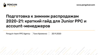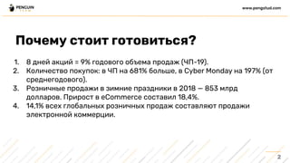 Документ представляет собой руководство по подготовке к зимним распродажам 2020-21 для специалистов в области PPC и аккаунт-менеджеров. В нем рассматриваются ключевые факторы, такие как рост объема продаж, популярные категории товаров и праздничный календарь, а также рекомендации по оптимизации рекламных кампаний. Также содержится анализ и планирование, которые помогут максимизировать эффективность акций в период распродаж.