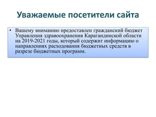 Документ представляет собой гражданский бюджет управления здравоохранения Карагандинской области на 2019-2021 годы, описывающий направления расходования бюджетных средств по различным программам. В нем приведены данные о бюджетных расходах на услуги в области здравоохранения, повышения квалификации кадов, пропаганды здоровья и других мероприятий. Бюджет включает суммы на каждую программу за три года, отражая разносторонние расходы на здравоохранение в регионе.