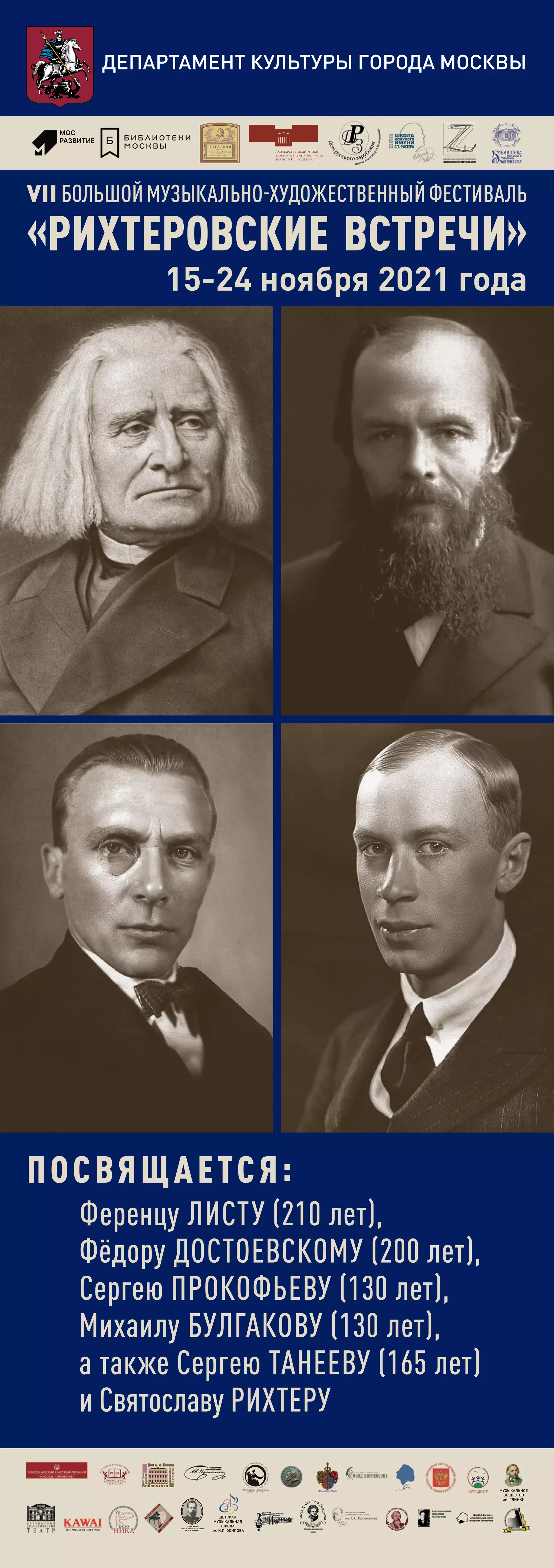 VII Большой музыкально-художественный фестиваль «Рихтеровские встречи» пройдет с 15 по 24 ноября 2021 года в Москве, посвященный юбилеям выдающихся композиторов и писателей. Программа фестиваля включает 60 мероприятий, включая концерты, лекции и выставки, с участием 31 организации, которая будет проходить как в оффлайн, так и в онлайн формате. Фестиваль акцентирует внимание на культурном наследии Ференца Листа, Фёдора Достоевского и других знаменитых личностей.