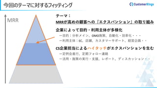 今回のテーマに対するフィッティング MRR テーマ: MRRが高めの顧客への『エクスパンション』の取り組み 企業によって目的・利用主体が多様化 ー目的:分析メイン、OMO施策、自動化・効率化・・・ ー利用主体:EC、店舗、カスタマーサポート、経営企画・・ CS企業担当によるハイタッチがエクスパンションを生む ー定例会進行、定期フォロー連絡 ー活用・施策の実行・支援、レポート、ディスカッション・・