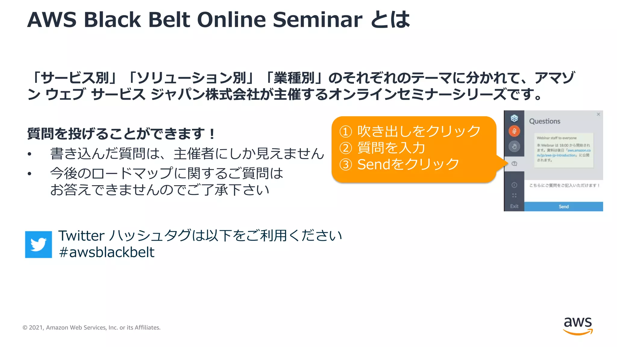 Web Services, Inc. or its Affiliates. 4月以降のBlack Belt Online Seminarについて ライブ配信によるBlack Belt Online Seminarは3月一杯で終了し、 今後はオンデマンドによる定期配信に変更いたします。 今後もコンテンツを拡充して行きますので、楽しみにお待ちください。 オンデマンドでの配信スケジュールは、AWS Blog, AWSニュースレ ターでお知らせいたします(5月17日週に再開を予定しています)