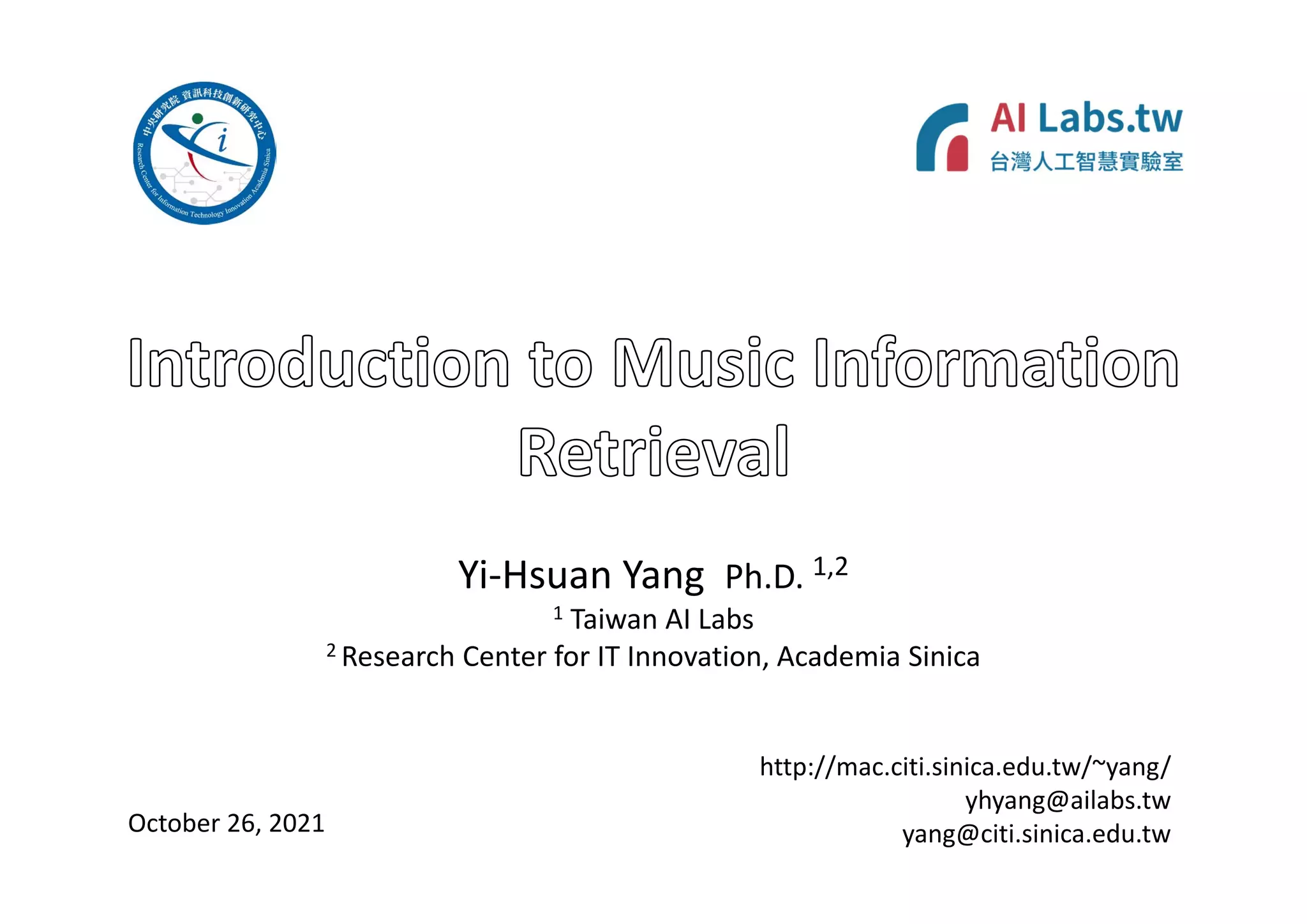 The document presents the profile of Yi-Hsuan Yang, a research professor at Academia Sinica and chief music scientist at Taiwan AI Labs, highlighting his extensive work in music information analysis, retrieval, and generation. It outlines various research products and methodologies used in the Music AI Lab, including intelligent music analysis tools and context-aware music retrieval systems, along with foundational concepts in music signal processing. Additionally, it discusses the types of data utilized in music research, emphasizing the integration of signal processing, machine learning, and musicology.