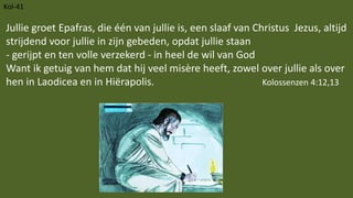 Jullie groet Epafras,die één van jullie is, een slaaf van Christus Jezus, altijd