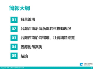 本文件讨论了台湾西南沿海的渔电共生推动情况与环境、社会议题的综合检视。文件中详细阐述了太阳光电政策的推广框架、环境和社会影响的议题分类及其对地方的潜在影响。通过环境社会检查机制,确保在推动渔电共生时有效应对各类环境和社会问题。