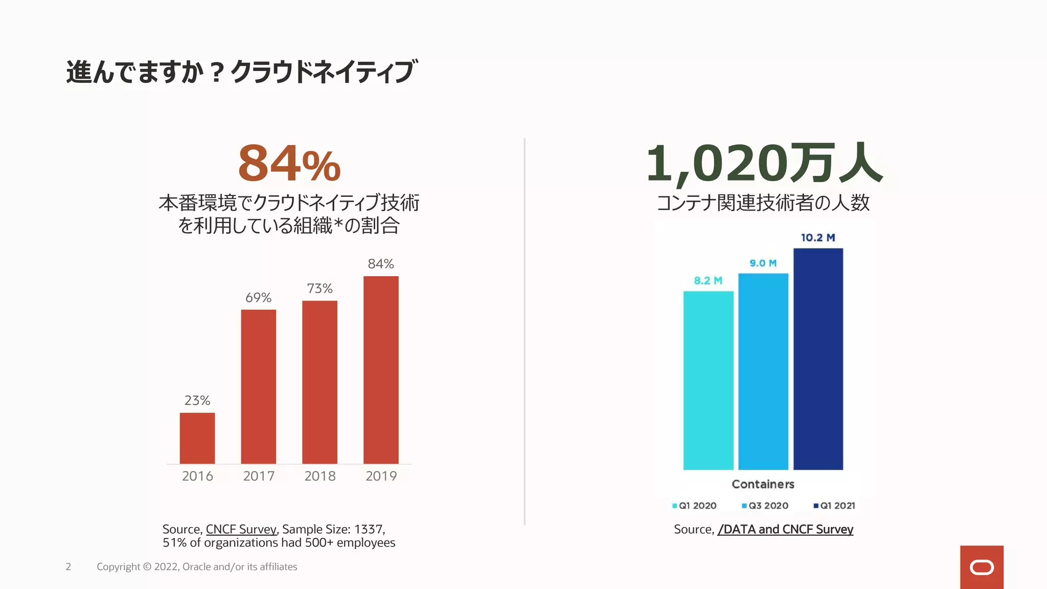 2022, Oracle and/or its affiliates 1,020万⼈ コンテナ関連技術者の⼈数 84% 本番環境でクラウドネイティブ技術 を利⽤している組織*の割合 Source, CNCF Survey, Sample Size: 1337, 51% of organizations had 500+ employees 23% 69% 73% 84% 2016 2017 2018 2019 Source, /DATA and CNCF Survey