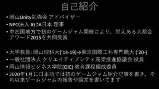 NPO法人 IGDA日本 理事 • 中四国地方で初のゲームジャム開催により、栄えある大都会 アワード2015を共同受賞 • 大学教員: 岡山理科大(’14-19)→東京国際工科専門職大 (‘20-) • 一般社団法人 クリエイティブシティ高梁推進協議会 役員 • 岡山情報ビジネス学院(OIC) 教育課程編成委員 • 2020年1月に日本語では初のゲームジャム紹介記事を書き,そ れ以来ゲームジャムの報告や論文を書いてます