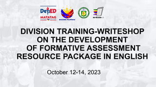 The document outlines a division training-writeshop focused on developing a formative assessment resource package for reading assessments in English, scheduled for October 12-14, 2023. It details materials and guidelines for conducting fluency and comprehension tests for students in grades 7-12, including preparation, administration, and validation processes. Additionally, it emphasizes the importance of using assessment results to inform reading interventions and enhance school reading programs.