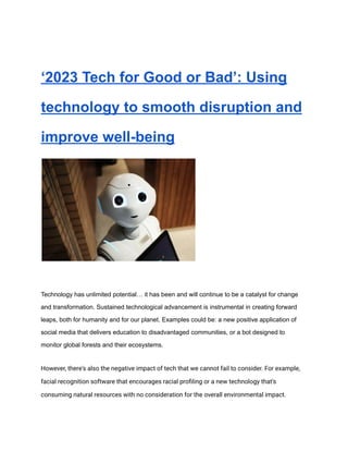 The document discusses the dual nature of technology over the past 12-18 months, highlighting its potential to improve well-being and facilitate positive change, while also acknowledging negative impacts such as privacy concerns and social isolation. It specifically mentions humanoid robots equipped with AI as a significant development that can both enhance human capabilities and pose risks to autonomy. The document emphasizes the need to carefully consider the long-term social and environmental implications of such technologies.