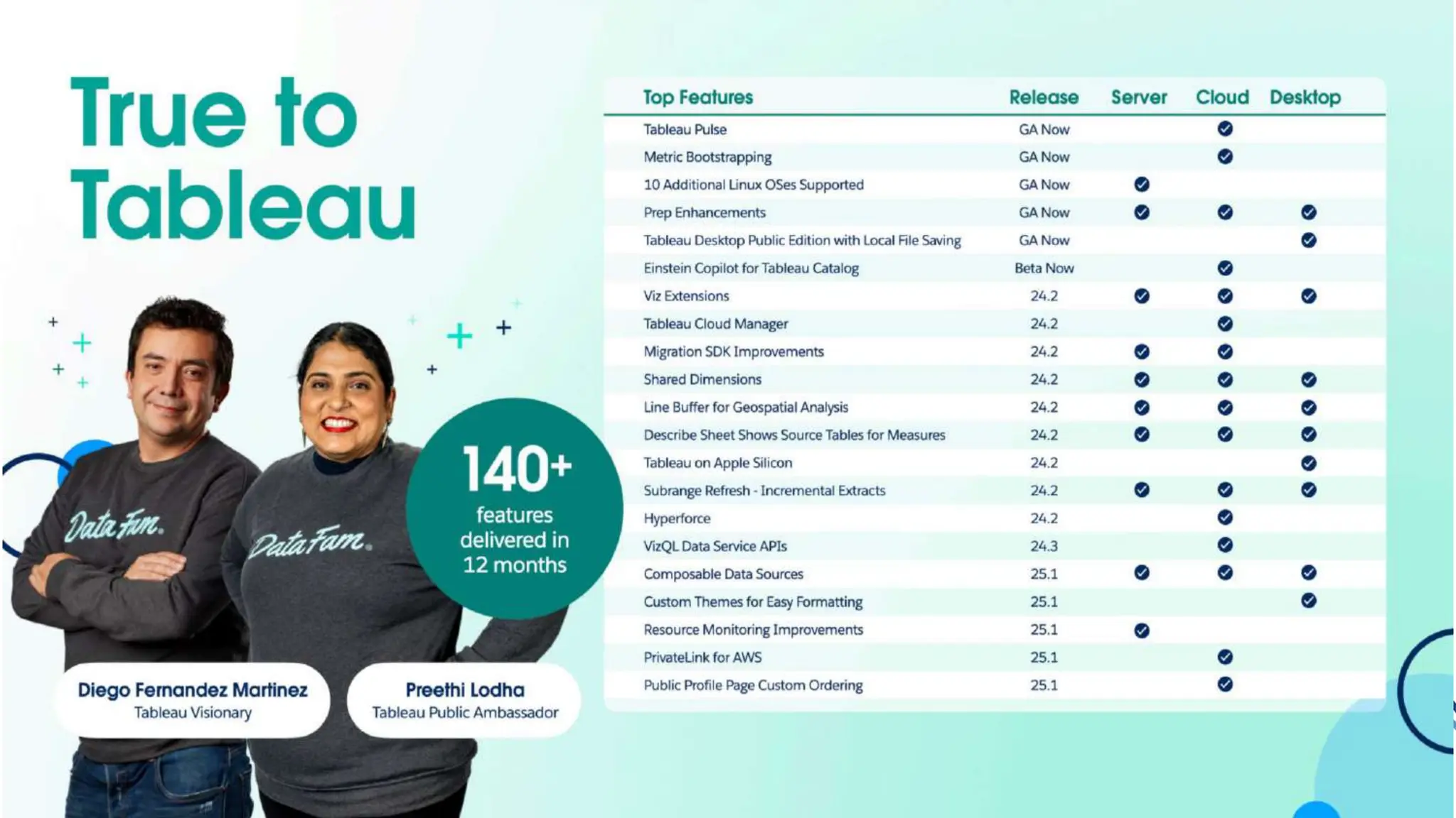 The document presents an overview of new features in Tableau, highlighting the integration of AI through Tableau Pulse and the Einstein Copilot to enhance data analytics and decision-making. It outlines Tableau's community support, upcoming product updates, and the emphasis on creating a data culture within organizations. Additionally, it addresses various forward-looking statements related to risks and uncertainties that may impact future performance and growth.