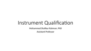 The document outlines the principles and procedures related to HPLC (High-Performance Liquid Chromatography) instrument qualification and calibration, focusing on the critical phases of validation, including design, installation, operational, and performance qualification. It emphasizes the importance of clear user requirement specifications (URS) in ensuring that instruments are properly qualified and maintained throughout their operational life. Additionally, it discusses component qualification, regulatory considerations, and the necessity for ongoing performance verification to ensure reliable analytical results.