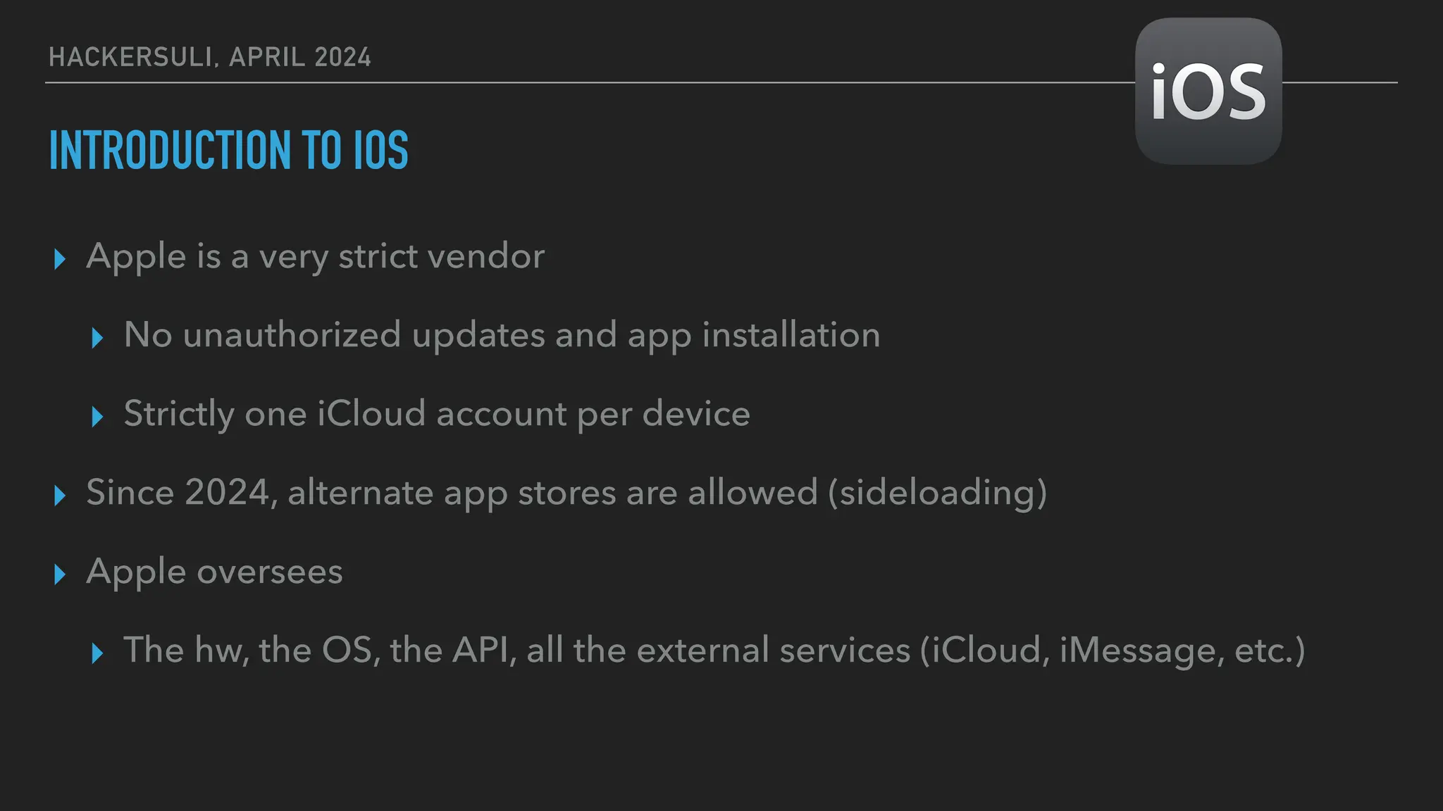 The document discusses security issues in mobile applications on iOS and Android. It provides an overview of iOS security features like sandboxing, the secure enclave, and full disk encryption. It also discusses potential risks like what data is stored in app bundles and sandboxes. For Android, it describes the more open ecosystem and risks of data storage on external storage or via backups. The document outlines threats like malware targeting banking apps and issues with permissions, exported app components, and inter-process communication.