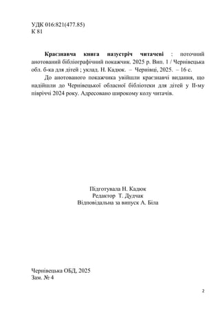 Краєзнавча книга назустріч читачеві : поточний анотований бібліографічний покажчик. 2025 р. Вип. 1 / Чернівецька обл. б-ка для дітей ; уклад. Н. Кадюк. – Чернівці, 2025. – 16 с.