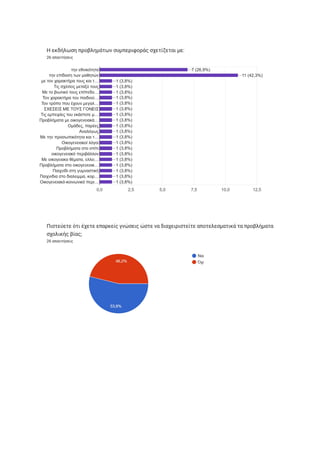 Το παρόν ερωτηματολόγιο χρησιμοποιήθηκε για την αξιολόγηση-αποτίμηση του προγράμματος της Σχολικής Διαμεσολάβησης, προκειμένου να διερευνηθούν οι απόψεις, οι θέσεις και οι στάσεις των εκπαιδευτικών για την καλλιέργεια των επικοινωνιακών και κοινωνικών δεξιοτήτων, τα αίτια των συγκρούσεων και τη Διαμεσολάβηση ως εργαλείο αντιμετώπισής τους στη μαθητική κοινότητα, μετά την υλοποίηση του προγράμματος της σχολικής διαμεσολάβησης. Παρακάτω παρατίθενται τα αποτελέσματα του ερωτηματολογίου:
