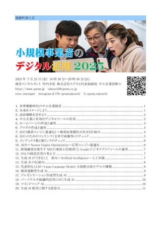 月 25 日(金) 18 時 30 分~20 時 30 分(2h) 経営コンサルタント 竹内幸次 株式会社スプラム代表取締役 中小企業診断士 https://www.spram.jp takeuchi@spram.co.jp note:smemgmt Instagram & FB:spramtakeuchi X:spram_takeuchi 1.世界激動時代の中小企業経営 ................................................................................... 1 2.未来をイメージしよう................................................................................................... 1 3.成長戦略を定めよう ................................................................................................... 2 4.中小企業に有効なデジタルツールの活用..................................................................... 2 5.ホームページの作成と運用......................................................................................... 4 6.ブログの作成と運営................................................................................................... 4 7.SEO(検索エンジン最適化)~検索結果順位が決まる仕組み ........................................... 4 8.SEO のためのコンテンツ(文章や画像等)のチェック ....................................................... 5 9.インデックス数と被リンクのチェック................................................................................ 6 10.AEO=Answer Engine Optimization=応答エンジン最適化 ............................................ 6 11.新規顧客を増やす MEO(地図上位検索)と Google ビジネスプロフィールの運用 ............... 7 12.SNS の経営活用の考え方 ......................................................................................... 7 13.生成 AI ができること ※AI=Artificial Intelligence=人工知能....................................... 7 14.生成 AI の仕組み..................................................................................................... 8 15.代表的な LLM=Large Language Models 大規模言語モデルの種類................................ 8 16.検索連動型生成 AI.................................................................................................. 9 17.プレゼンテーション作成型生成 AI .............................................................................. 9 18.パーソナルや組織的活用に向く生成 AI .....................................................................10 19.マインドマップ AI.....................................................................................................10 20.生成 AI 使用に関する留意点....................................................................................11