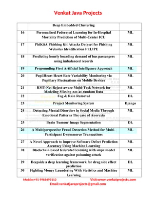The document presents a list of 50 Java and Python projects for 2025, focusing on various domains including artificial intelligence, machine learning, cybersecurity, and deep learning. Each project is briefly described, showcasing diverse applications such as music recommendation systems, anomaly detection, and fraud detection methods. Contact information and a website for further details are also provided.