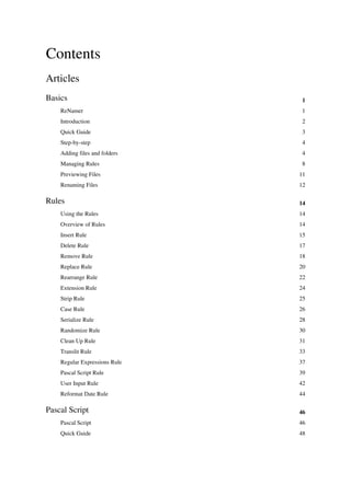 Renamer is a versatile file renaming tool that enables users to perform a variety of renaming operations, including adding prefixes, suffixes, and applying complex rules using Pascal scripting. It supports Unicode, handles name conflicts, and allows for the renaming of multiple folders and files simultaneously. Users can preview changes before committing and manage renaming rules efficiently through a user-friendly interface.