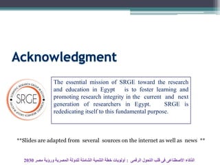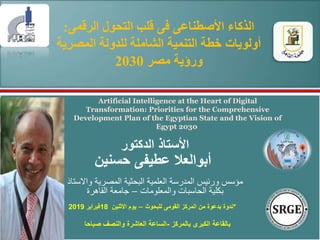 The document announces a lecture being given on February 18, 2019 at the National Research Center in Cairo on the topic of "Artificial Intelligence at the Heart of Digital Transformation: Priorities for the Comprehensive Development Plan of the Egyptian State and the Vision of Egypt 2030". The lecture will be given by Dr. Aboul Ella Hassanein, founder and head of the Egyptian Scientific Research Group and professor of information technology at Cairo University. The agenda covers various aspects of digital transformation and its importance for Egypt's development goals.