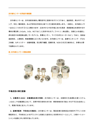 赤外線センサーは、赤外放射を検知し電気信号に変換するデバイスであり、温度測定、熱分布マッピング、存在/動体検知、および特性赤外吸収に基づくガス検知を実現します。一般的に、赤外線センサーは主に二つのカテゴリに分類されます:近赤外から中赤外域における高速・高感度検出を実現する半導体光電効果(InGaAs、InSb、MCTなど)に依存する光子(フォトン)検出器と、放射による温度上昇を測定する熱型検出器(サーモパイル、焦電センサー、マイクロボロメーターなど) であり、後者は温度測定、人感検知、熱画像撮影に広く用いられます。赤外線センサーは、産業モニタリング・プロセス制御、セキュリティ・自動車認識、民生電子機器、医療計測、NDIR方式ガス検知など、多様な分野で展開されています。