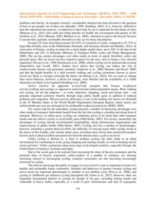 This document summarizes a research article from the International Journal of Civil Engineering and Technology that examines factors influencing bicycle use in Upper Egypt. The article investigates the low levels of cycling in Upper Egypt through a questionnaire of 925 male and female students. It finds that 58% of males and 22% of females would be potential bicycle users if safe infrastructure and parking existed. The main barriers to cycling are a lack of infrastructure, safety concerns, social norms, and safe parking. Encouraging cycling in Upper Egypt would require policies promoting cycling and changing cultures through media to increase acceptance.