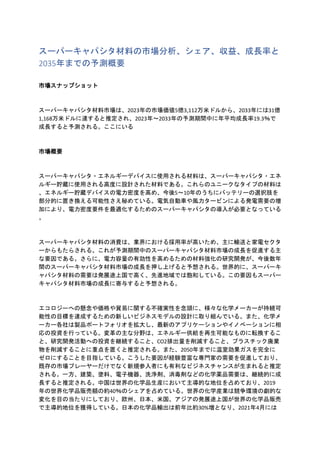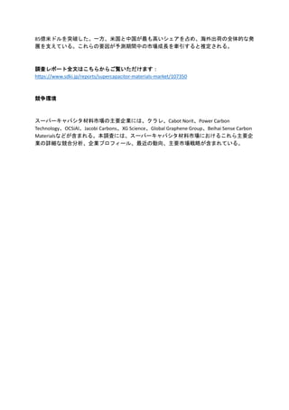 スーパーキャパシタ・エネルギーデバイスに使用される材料は、スーパーキャパシタ・エネルギー貯蔵に使用される高度に設計された材料である。これらのユニークなタイプの材料は、エネルギー貯蔵デバイスの電力密度を高め、今後5~10年のうちにバッテリーの選択肢を部分的に置き換える可能性さえ秘めている。電気自動車や風力タービンによる発電需要の増加により、電力密度要件を最適化するためのスーパーキャパシタの導入が必要となっている。