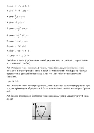 Документ описывает урок по теме нахождения наибольшего и наименьшего значения функции на отрезке, цели и задачи которого включают формирование навыков применения алгоритма решения задач. Урок состоит из организационного момента, актуализации знаний, изучения нового материала, закрепления умений, а также итогового оценивания и домашнего задания. Ожидаемый результат – умение учащихся находить экстремумы функций с помощью изученного алгоритма.