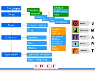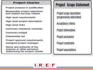 This document discusses project scope management for construction projects. It defines project scope as ensuring a project contains all required work and only the required work. The key processes are: collecting requirements, defining the scope statement, creating a work breakdown structure (WBS), validating the scope, and controlling scope. Requirements are gathered from stakeholders using techniques like interviews and workshops. The scope statement and WBS break the project scope into manageable components. Scope validation obtains customer acceptance, while scope control compares work to the baseline to ensure all approved scope is delivered.