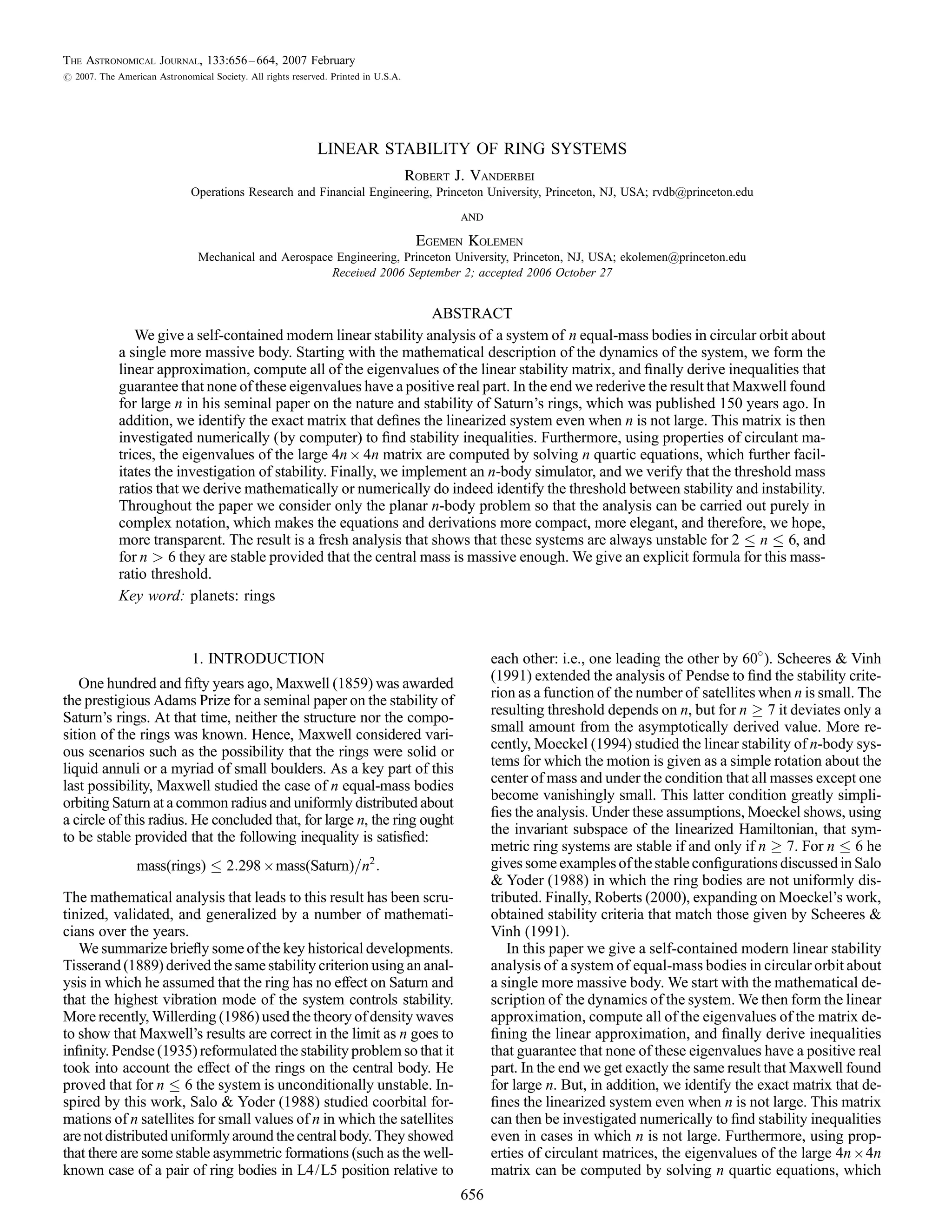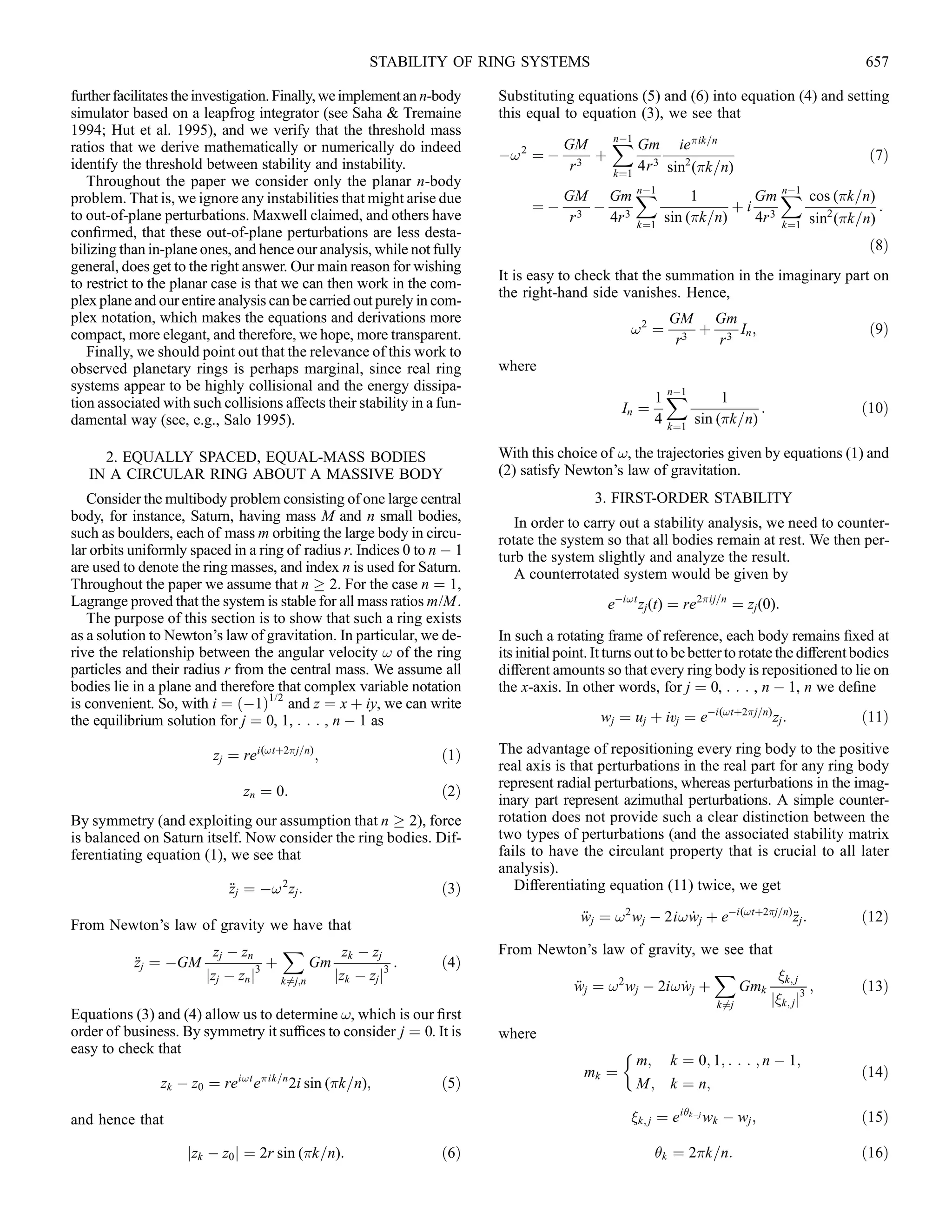 The document presents a linear stability analysis of a system of n equal-mass bodies orbiting a central massive body in circular orbits. It begins by describing the mathematical model of the system and deriving the relationship between angular velocity and orbital radius. It then performs a linear stability analysis by introducing small perturbations and deriving the equations governing their evolution. This leads to a large stability matrix whose eigenvalues determine stability. Properties of circulant matrices allow solving for the eigenvalues via quartic equations, facilitating further analysis. Numerical simulations verify the theoretical stability thresholds.