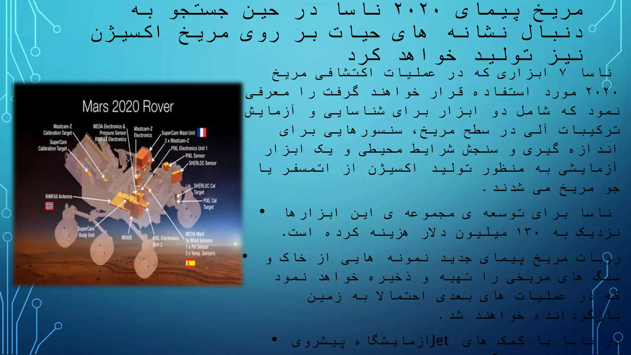 حین در ناسا اکسیژن مریخ روی بر حیات های نشانه دنبال کرد خواهد تولید نیز ناسا۷مریخ اکتشافی عملیات در که ابزاری ۲۰۲۰معرفی را گرفت خواهند قرار استفاده مورد آزمایش و شناسایی برای ابزار دو شامل که نمود ،مریخ سطح در آلی ترکیباتسنسورهاییبرای ابزار یک و محیطی شرایط سنجش و گیری اندازه یا اتمسفر از اکسیژن تولید منظور به آزمایشی شدند می مریخ جو. • ابزارها این ی مجموعه ی توسعه برای ناسا به نزدیک۱۳۰است کرده هزینه دالر میلیون. • روباتنمونه جدید پیمای مریخهاییو خاک از نمود خواهد ذخیره و تهیه را مریخی های سنگ زمین به ًاحتماال بعدی های عملیات در که شد خواهند بازگردانده. • پیشروی آزمایشگاهJet های کمک با ناسا در