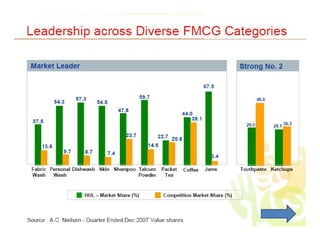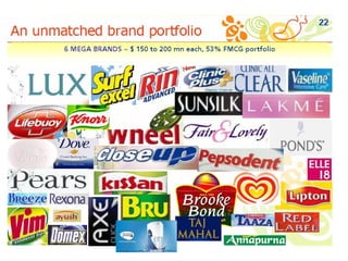 The document provides information about Unilever and its detergent brand Surf Excel. It discusses Unilever's mission and introduction in India. It then focuses on Surf Excel, describing its brand evaluation history, product range and pricing, demand and supply analysis, distribution strategy, SWOT analysis, and forecasting of demand. The market structure is described as an oligopoly dominated by a few major players like HUL, Nirma, P&G, and Henkel India.