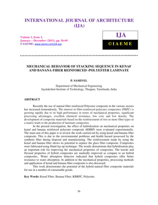 This document summarizes research on mechanical behavior of stacking sequences in kenaf and banana fiber reinforced polyester laminate composites. It discusses how natural fiber composites are growing in use due to advantages over synthetic fibers like lower cost and environmental impact. The research aims to develop and test a new class of laminate composites with kenaf and banana fibers in different stacking sequences. Mechanical properties like tensile strength, flexural strength, tensile modulus and impact strength are evaluated to understand the effect of hybridization and stacking sequence on mechanical behavior.