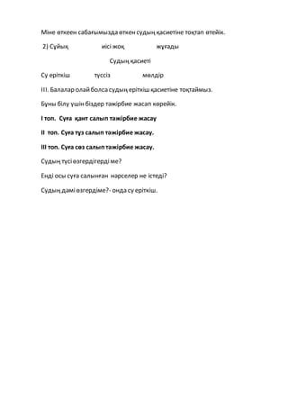 1)Сабақтың тақырыбы:Су еріткіш.Судаеритінжәне ерімейтінзаттар. Судың