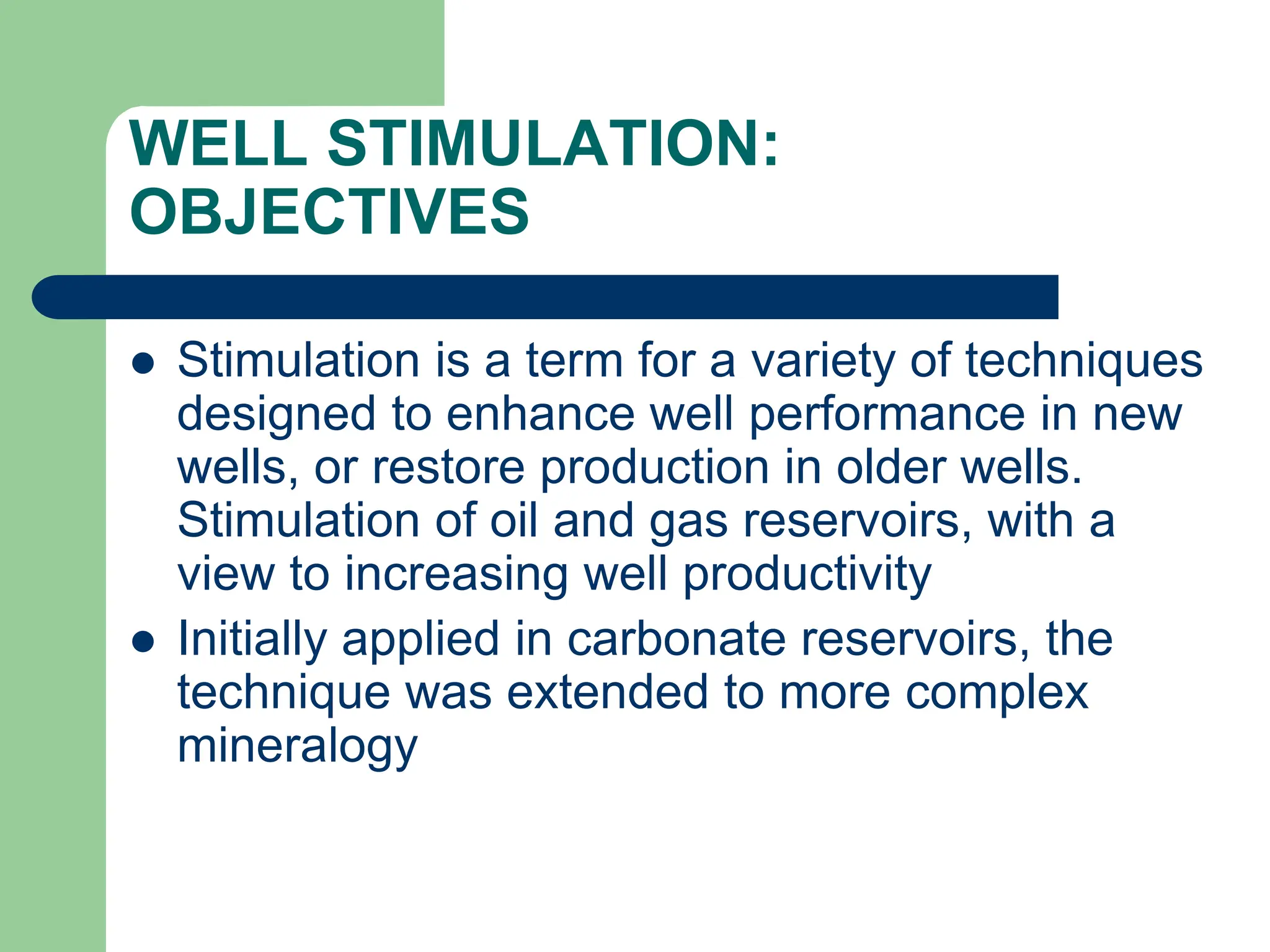 Well stimulation is a process used to increase well productivity by techniques like hydraulic fracturing, acidizing, and nitroshooting. Stimulation aims to enhance production in new or older wells in oil and gas reservoirs. Key methods are hydraulic fracturing which creates fractures, acidizing which involves using acid to remove damage and improve permeability near the wellbore, and nitroshooting which uses explosives. Success is evaluated by comparing productivity indexes before and after stimulation.