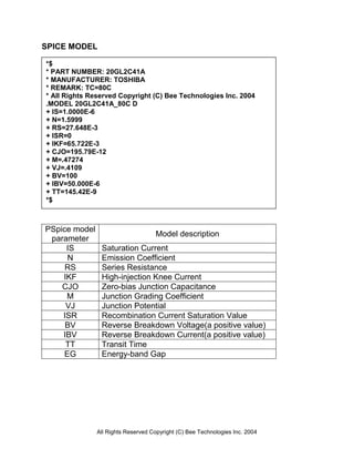 This document summarizes the specifications and simulation results for a TOSHIBA 20GL2C41A general purpose rectifier diode. It includes the SPICE model parameters, forward current and capacitance characteristic graphs comparing simulation and measurement results, and a reverse recovery characteristic evaluation circuit. Simulation results closely matched measurement data with less than 5% error across operating conditions.